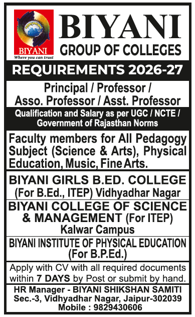 Biyani Group Of Colleges – Recruitments Note : Recruitment Open for 2026-27 Interested candidates may contact us for further details: 📞 Phone: +91-9829430606