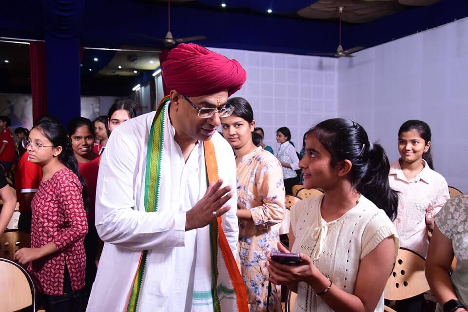 The event began with a lamp-lighting ceremony. Chief Guest, Former High Court Justice J.K. Ranka, was joined by Dr. Rajeev Biyani (Chairman), Dr. Sanjay Biyani (Academic Director), Dr. Dhyan Singh Gothwal (Principal), CA Abhishek Biyani (Assistant Director), and key members from Vedanta Foundation including Prof. Shubha Sharma, Sujata (National Coordinator), and Tahir Vohra (Vocational Training Head).